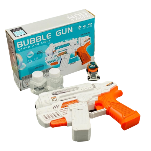 Let the fun flow with the Bubble Gun with Sound and Light! Perfect for children aged 3 and up, this battery-operated bubble pistol is ideal for outdoor play, poolside activities, or summer parties. It comes with vibrant sound and light effects to enhance the play experience, providing hours of joy. With two bottles of bubble solution included, kids can dive straight into the fun.Available now at Yousaf Toys—add some bubbly excitement to playtime today!